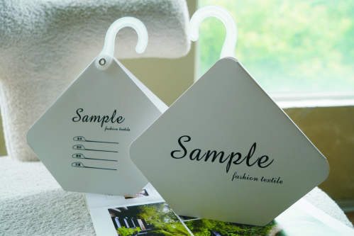 特价80元/100个 纸张700克白卡 厚度约0.9mm 文字烫黑金 表面哑膜 尺寸长170mm*宽170mm*折痕5mm 加厚透明塑料钩 气眼空心扣 圆角模切