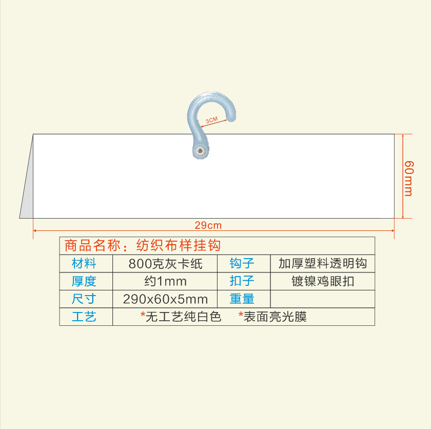 纸张800克灰卡 厚度约0.9mm 加厚塑料透明钩 气眼空心扣 尺寸长370mm*宽(对折后)80mm*折痕宽5mm